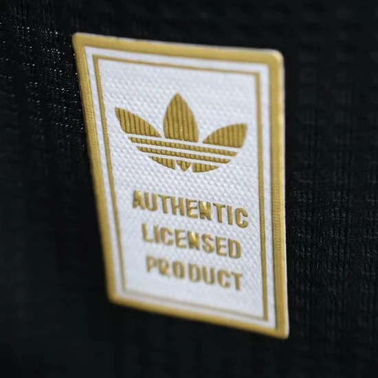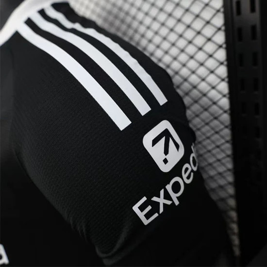 La tercera camiseta de portero de Adidas Liverpool 25-26 es predominantemente negra con detalles en blanco. La camiseta presenta sutiles rayas verticales en tonos similares tejidas en el tejido, lo que añade una textura discreta al diseño. Una característica clave es el cuello redondo blanco grueso y prominente, complementado con las clásicas tres rayas blancas de Adidas que recorren los hombros.